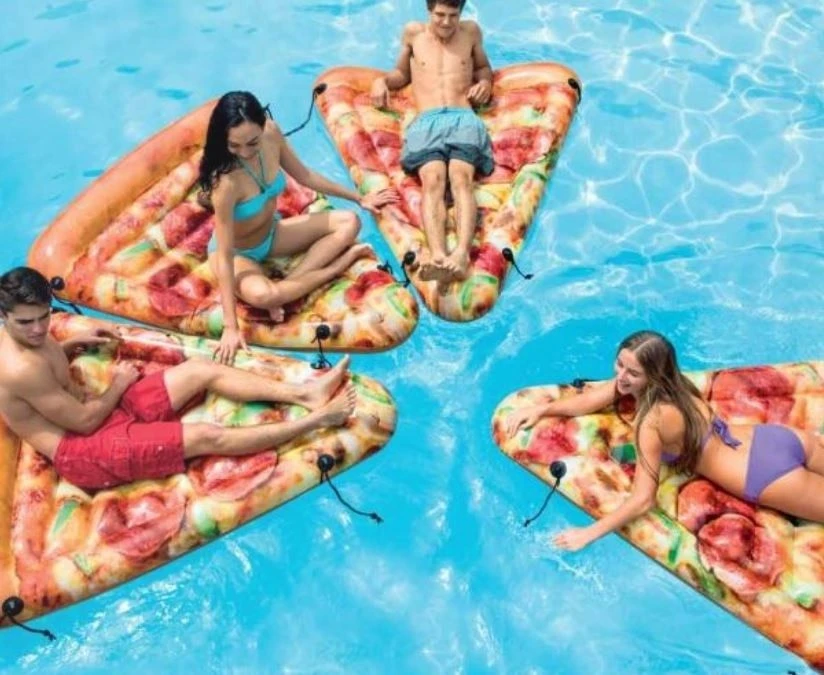 Dit luchtbed in de vorm van een pizza is een echte eyecatcher voor in het zwembad.