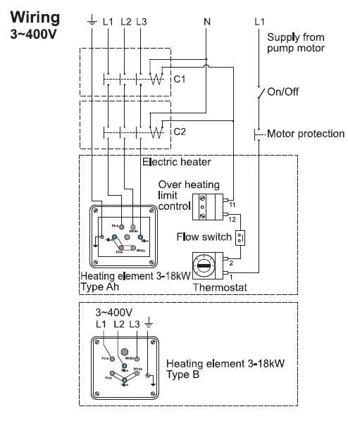 De elektrische verwarmer moet worden aangesloten op een contactor (relais) in de technische ruimte van het zwembad.