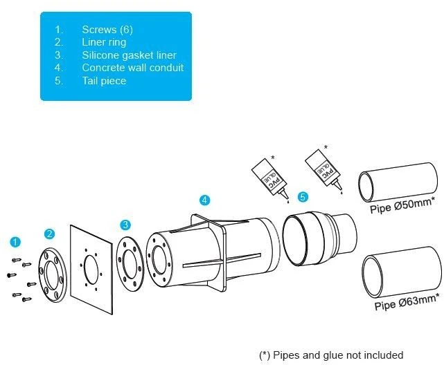 Wanddoorvoer voor baden met wanden in beton of steen, voor liner en mozaiek baden.