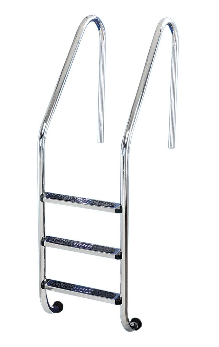 - De standaard roestvaststalen zwembadtrappen zijn van AISI-316 staal, ø 43 mm buis, met roestvaststalen treden