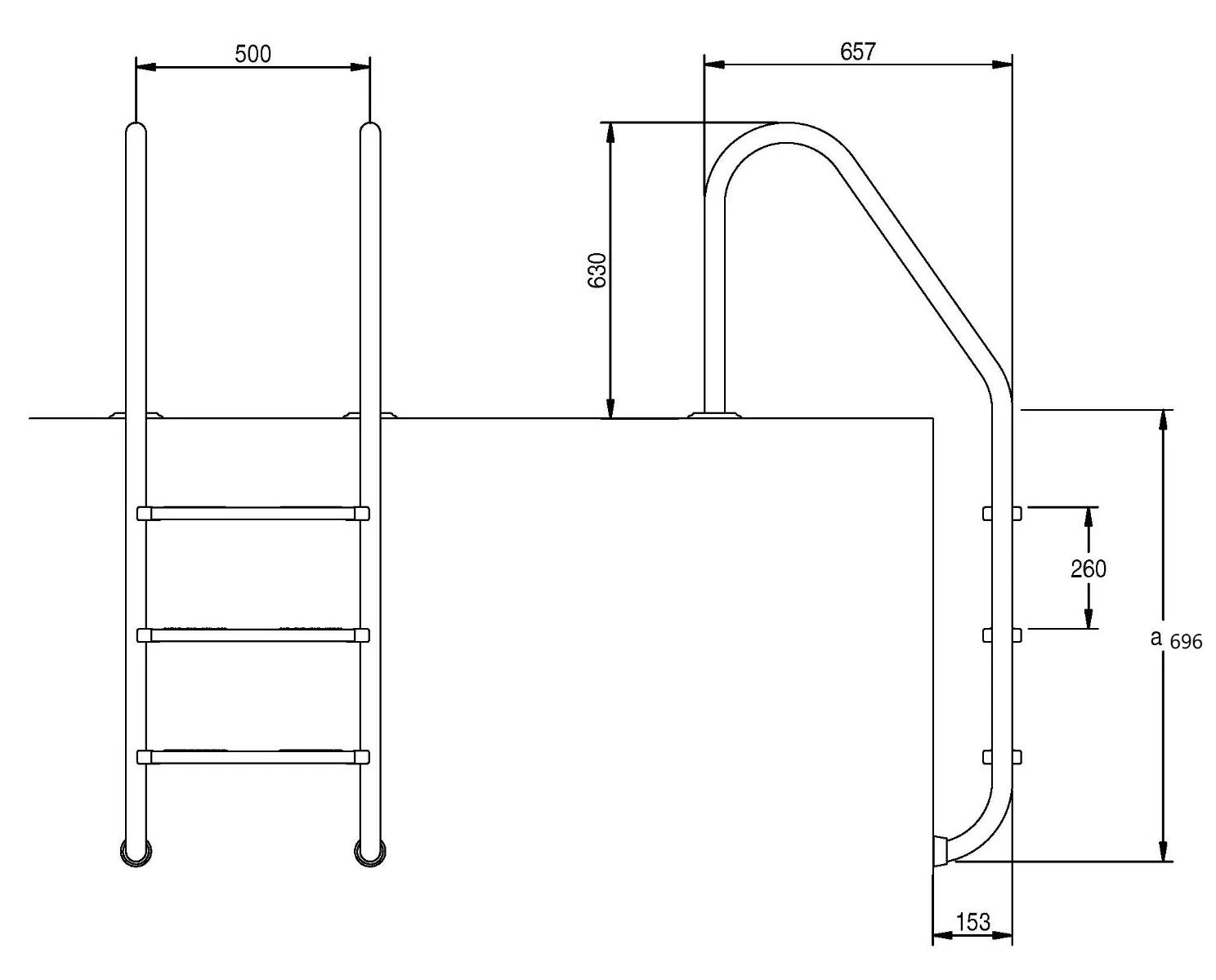 - De standaard roestvaststalen zwembadtrappen zijn van AISI-304 staal, ø 43 mm buis, met roestvaststalen treden.